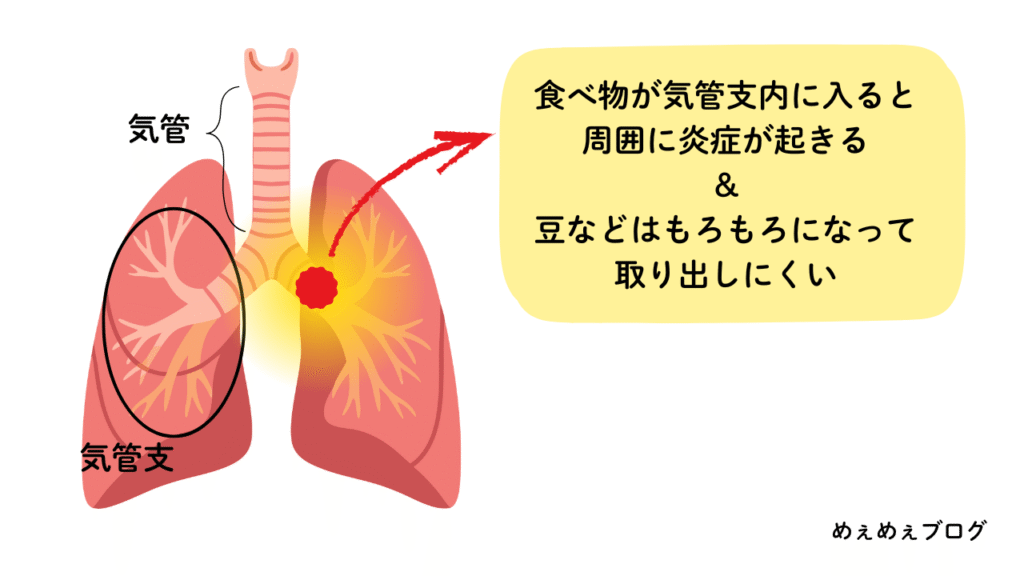 気管は先へ進むと、枝分かれして気管支と呼ばれます。気管支内に食べ物が留まった場合、呼吸困難になりますが、もう一方の肺が機能している間は、窒息死には至りません。ただし、肺や気管支に炎症が起きます