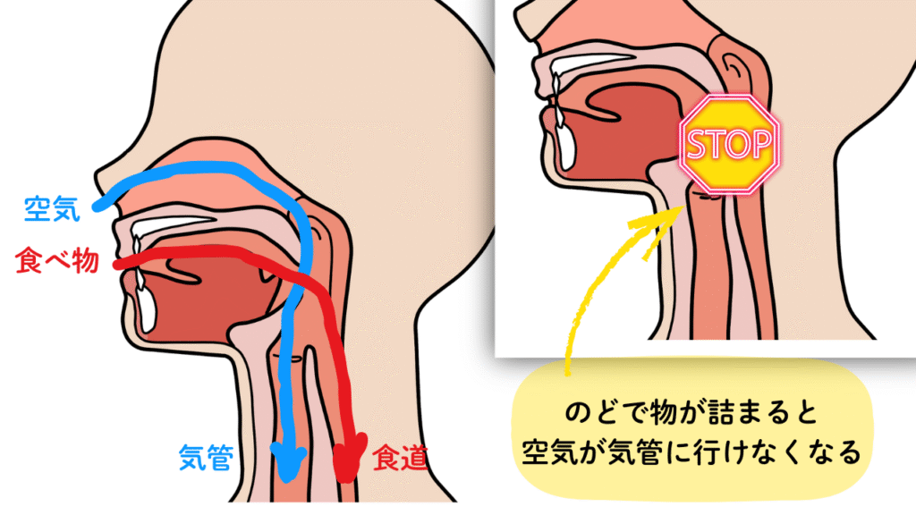 食べ物等がのどに詰まらずに声帯を越えて、気管に入ってしまうと「誤嚥(ごえん)」という状態になります。気管内では、食品が水分を含み膨潤して気道を塞ぎ、窒息に至ることがあります
