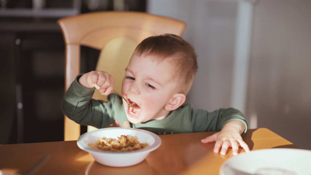 3. 正しい姿勢で食べさせる座って、食べることに集中させる